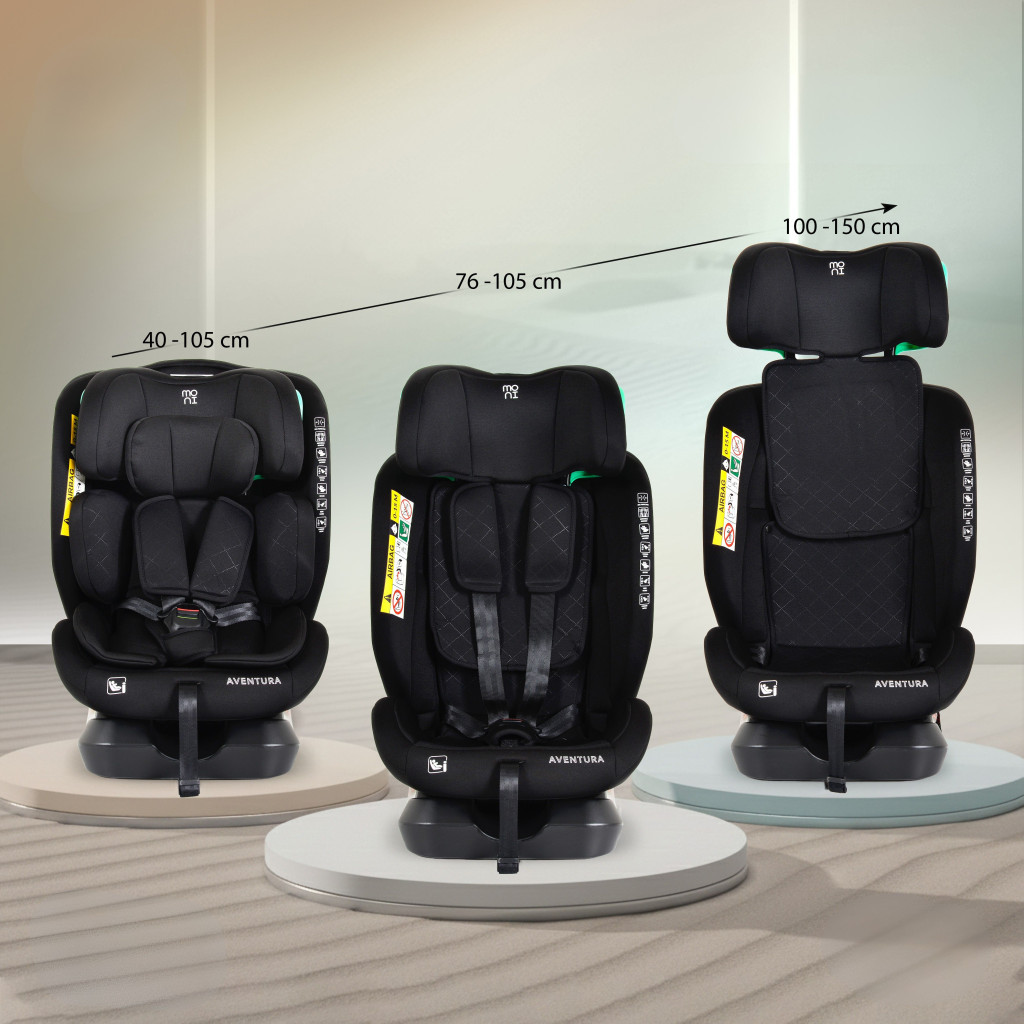 Moni Aventura autósülés úgy lett kialakítva, hogy minden utazás során magas szintű biztonságot, kényelmet és alkalmazkodóképességet biztosítson. Az R129/i-Size szabvány szerint jóváhagyott termék 40–150 cm magas gyermekek számára alkalmas, és a gyermek életkorának és fejlettségének megfelelően rugalmasan felszerelhető.
