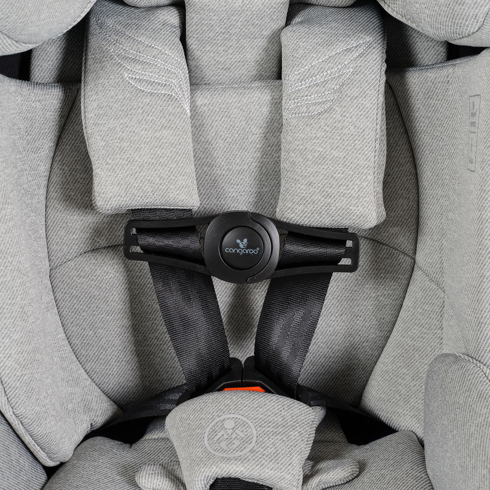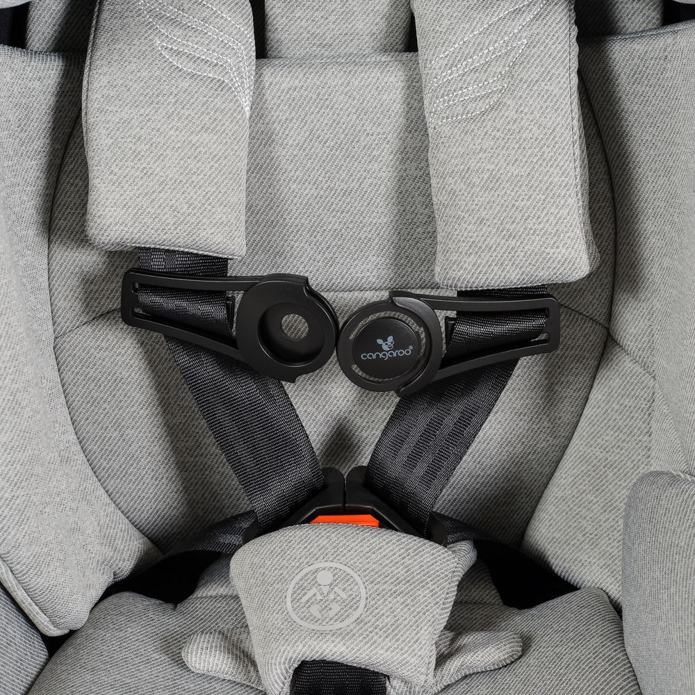 A csat két részből áll, amelyek könnyen összepattannak, oldalsó csatokkal pedig biztonságosan rögzíthetők a biztonsági övhöz. Akár 38 mm széles biztonsági övekkel is kompatibilis, így a legtöbb autósülés-modellhez alkalmas.