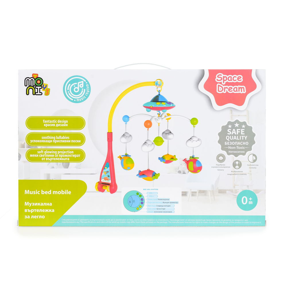 0 hónaposnál idősebb gyermekek számára. Serkenti a gyermek hang- és vizuális érzékelését, és hozzájárul a könnyebb elalváshoz. Megnyugtatja a babát. Elemekkel működik - 3x1,5 V AA. A mobil részen gombok találhatók: a hangerő növeléséhez és csökkentéséhez, a mobil rész és a játékok forgatásához, a kivetítő funkcióhoz, a dallam cseréjéhez a következővel, a bekapcsoláshoz: ON / OFF gomb. 180 fokos forgatás.