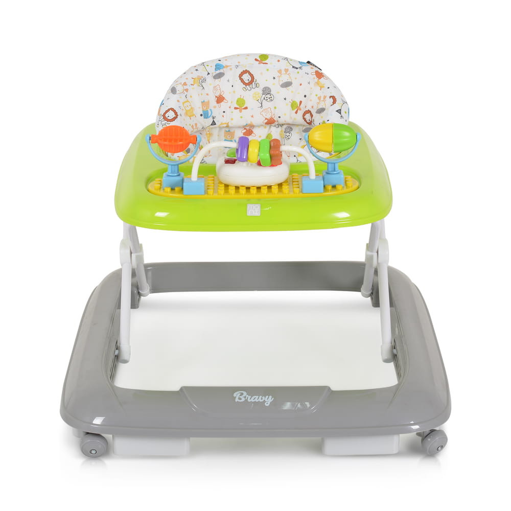 BRAVY bébikomp ZÖLD, 6 hónaposnál idősebb gyermekek számára. Tálca játékokkal és zenei funkciókkal. Minden játék megváltoztathatja a helyét. 4 fokozatú magasságállítás a gyermek magasságától függően. Puha ülés. 2 első forgó kerék. 2 hátsó kerék. Szilikon dugók.