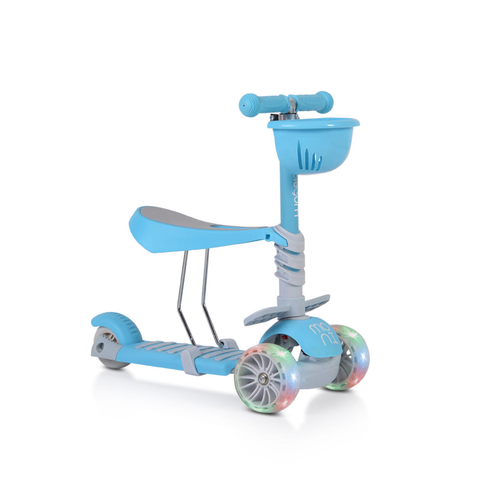 2in1 Gyermek kis roller üléssel, amely 24 cm és 30 cm között állítható magasságú. Az ülés terhelhető maximális súlya 20 kg-ig; álló helyzetben a terhelhető maximális súly 40 kg-ig. 3 éves kor felettieknek. Első világítós LED kerekek PU 120*50mm , hátsó kerék 90*46mm; ABEC-7 csapágyak. Fém ötvözetű váz, állítható magassággal 68 és 78 cm között. Első játékdoboz, tároló. Lábtartó a gyermek számára, ha a rollert üléssel használják. Világoskék