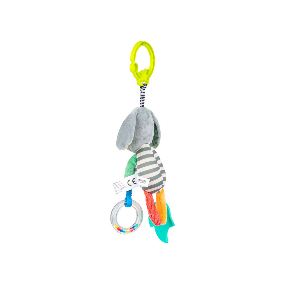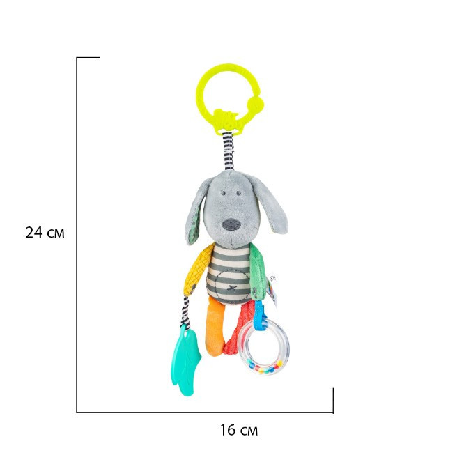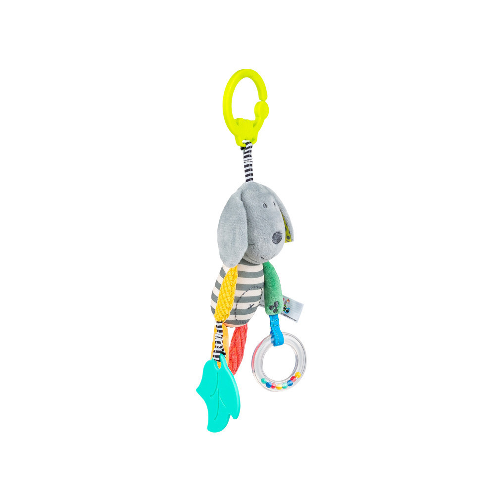 A kutya alakú, kompakt játék bárhová elkísérheti a babát, díszítheti az autósülést, a babakocsit vagy az ágyat. A bájos kutya változatos mintázatú és textúrájú anyagokból készült, aminek köszönhetően kiemeli a kisgyermek érzékeit, pozitívan befolyásolva kognitív képességeinek fejlődését. A kutya mancsait egy puha rágóka díszíti, amely megnyugtatja a fájó ínyt, és egy színes golyókkal teli csilingelő gyűrű. A játék praktikus tartójának köszönhetően könnyen bárhová rögzíthető. A termék születéstől kezdődő gyermekek számára készült.