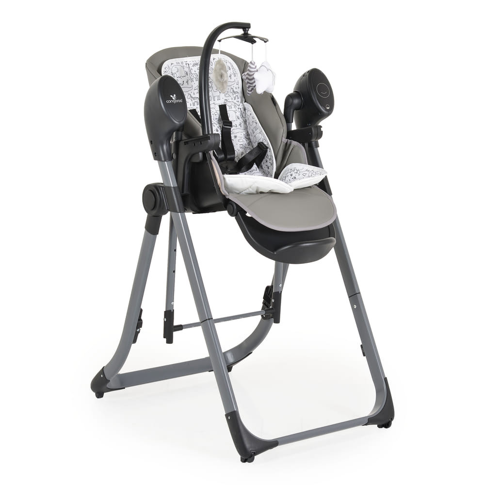 A multifunkcionális Nirvana 2in1 modell könnyedén átalakul babhintából etetőszékké. Etetőszékként használható önállóan ülni tudó, 6 hónaposnál idősebb és 15 kg-ig terjedő gyermekek számára. Babahinta funkciójában a termék 0 hónapos kortól és 9 kg-ig terjedő újszülöttek számára alkalmas. A kiváló minőségű PU bőrből készült széles ülésnek köszönhetően a gyermek rendkívül kényelmesen érzi majd magát. A nagyobb kényelem érdekében a készlet egy további puha párnát is tartalmaz újszülöttek számára. Az etetés közbeni maximális kényelem érdekében a szék 5 magasságállítási fokozatot kínál az üléshez és 3 dönthető pozíciót a háttámlához. Az állítható lábtámasz 3 pozícióba állítható. A pohártartóval ellátott, kivehető tálca két pozícióban állítható, és könnyen cserélhető egy három puha játékot tartalmazó játékrúddal. A szék 4 kerékkel van felszerelve a könnyű mozgathatóság érdekében. Gyermeke biztonságáról az 5 pontos biztonsági öv, puha vállpárnákkal gondoskodik. A heveder vállnál két magassági szintre állítható a gyermek növekedésének megfelelően. A szék nagyon könnyen összecsukható kompakt méretre, és bárhol tárolható otthon. Lengés üzemmódban a termék 5 lengési sebességet és egy 3 beállítási időzítőt kínál, míg az intelligens mozgásérzékelő aktiválja a lendítést, ha azt észleli, hogy babájának nyugtatásra van szüksége. A zenei funkció 12 dallamot, 5 természethangot és állítható hangerőszabályzót tartalmaz. A termék AC-DC adapterrel (tartozék) vagy 4xAA/LR6 elemmel (nem tartozék) működik. A készlet távirányítót is tartalmaz.