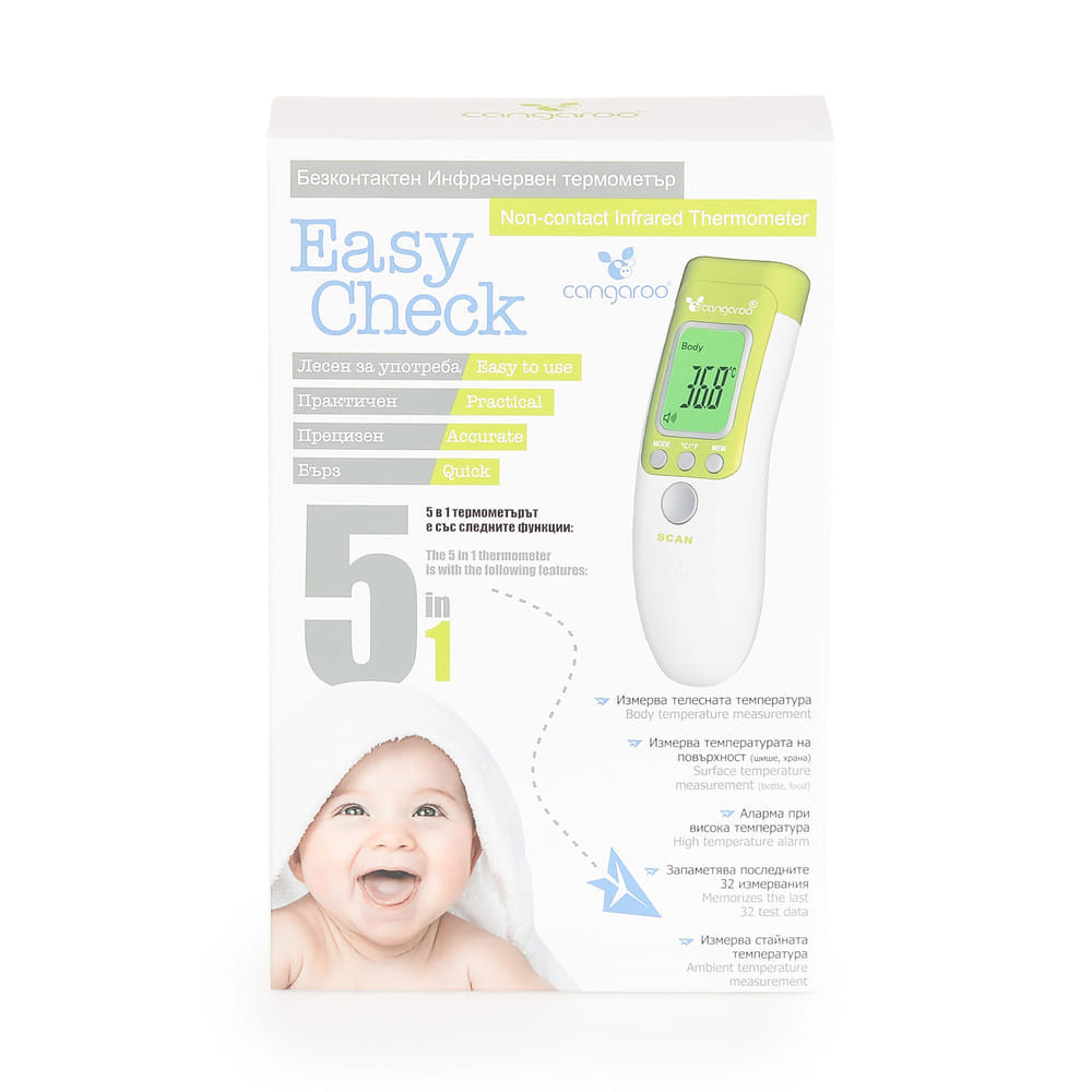 Az EASY CHECK infravörös hőmérő 5in1 egy csúcstechnológiai eszköz, amelyet a CANGAROO tervezett, hogy a mindennapi hőmérsékletmérés könnyebb és kényelmesebb legyen. Ez a hőmérő különféle felületek, beleértve az emberi test, az étel és a cumisüveg hőmérsékletének mérésére képes. Nem csak a hőmérsékletet méri, hanem riasztást is ad, ha a hőmérséklet túl magasra emelkedik. Nagyszerű funkciója, hogy a legutóbbi 32 mérési adatot is eltárolja, így könnyedén nyomon követhető a hőmérséklet változása. Ez a hőmérő a legmodernebb infravörös technológiát használja, ami lehetővé teszi a nem érintkező mérési módot, ezzel is minimalizálva a baktériumok terjedésének kockázatát. Így tehát nem csak praktikus, de higiénikus is.