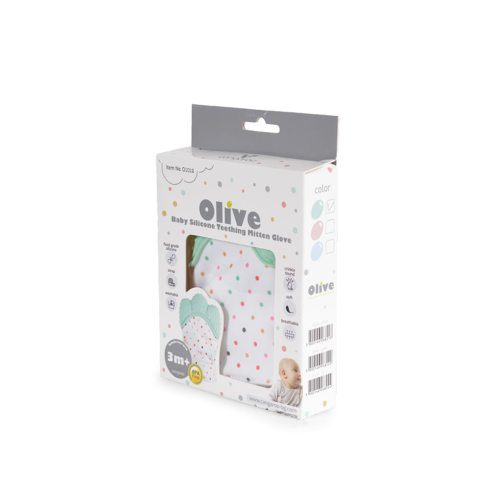 Az OLIVE Szilikon rágóka fogzáshoz menta, egy csecsemőknek tervezett, puha és légáteresztő anyagból készült kesztyű, amelyet a CANGAROO márka kínál. Ez a termék gyengéden enyhíti a baba ínyének fogzási kellemetlenségeit. A kesztyűben található szilikonrésznek köszönhetően a baba biztonságosan rágódhat, ugyanis a szilikon nem tartalmaz BPA-t. Menta színben kapható, ami vidám és friss hatást kölcsönöz a terméknek. Az online vásárlás kényelmét kínálja többek között az Ozone.bg, eMAG és Baby.bg webáruházakban.
