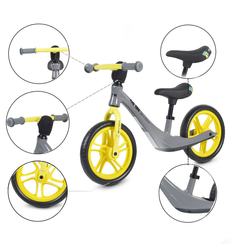 Egészségre ártalmatlan vízálló festékkel bevonva és biztonságos TPE markolatokkal, 12 hüvelykes habosított kerekekkel, állítható nyereggel 32cm-41cm. A kerekek nem fújhatóak, tömör PU.