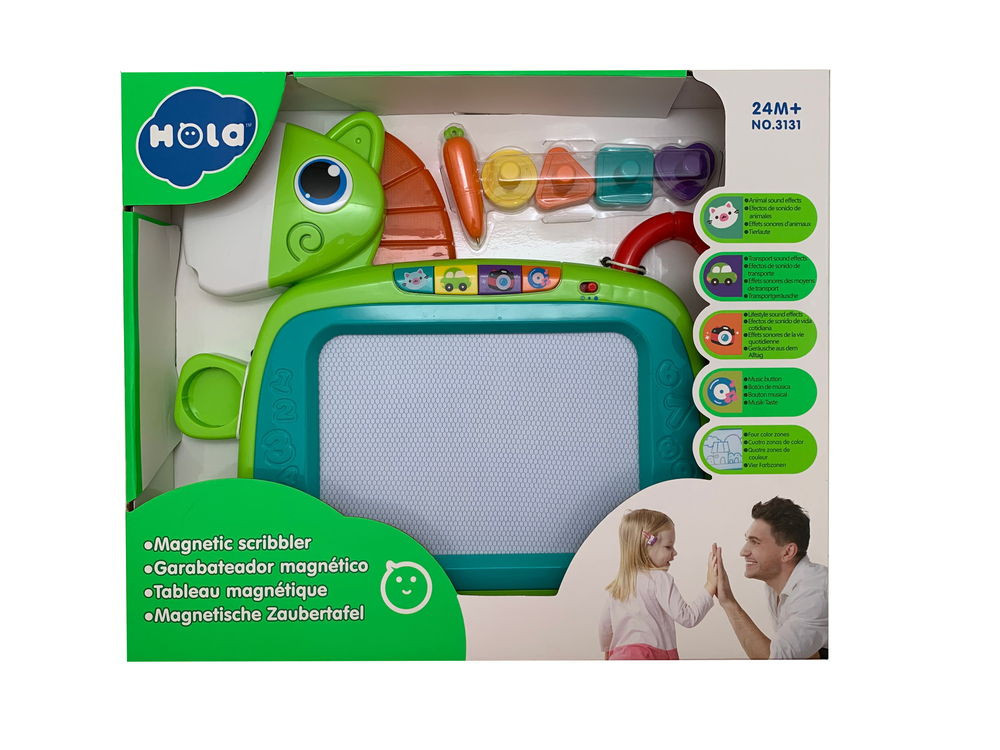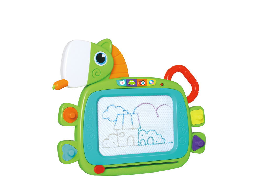 HOLA mágneses rajzoló tábla zenél, világít. Pónis kialakítás; ergonomikus fogantyú; hanghatás; zenegomb; a radírt oldalra csúsztatva tisztára törölheti a táblát és szórakoztató hanghatásokat játszhatTermékméret: