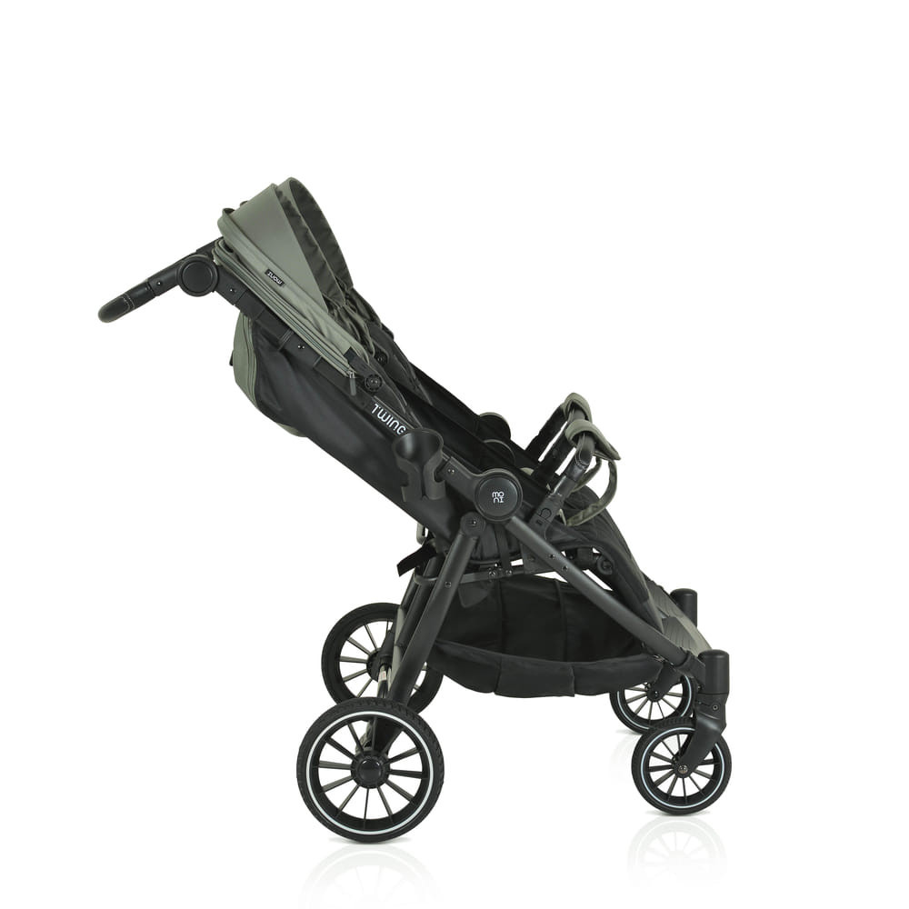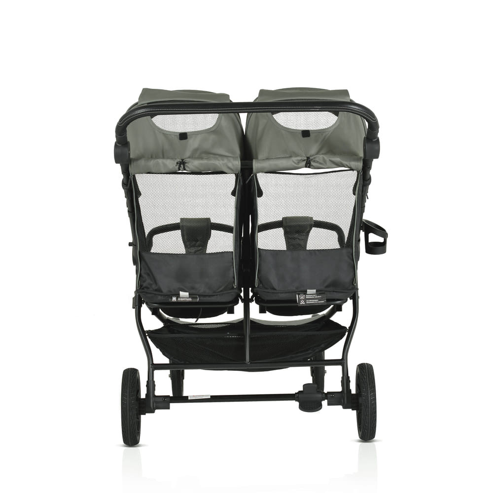 Az iker babakocsi születéstől körülbelül 36 hónapos korig alkalmas, legfeljebb 15 kg súlyú gyermekek számára. Három pozícióban dönthető háttámlával rendelkezik, beleértve a teljesen sík helyzetet, és egy hálós részt a jobb szellőzés érdekében. A kupola állítható, napellenzővel és hálós ablakkal a megfigyeléshez. A fogantyú állítható, öt pozícióban, varrott PU bőrből készült. Az 5 pontos biztonsági öv puha párnázással gondoskodik a biztonságról. A babakocsi első PU kerekekkel van felszerelve, amelyek 360 fokban forognak, reteszelő mechanizmussal és lengéscsillapítókkal minden keréken. A kerekek egy gombnyomással egyszerűen eltávolíthatók. Kompakt és könnyen összecsukható. Levehető PU bőr lökhárító rúd és három pozícióban állítható lábtámasz. A háttámlán tárolózseb áll rendelkezésre a tartozékok számára. A készlet praktikus cipzáras lábvédőt és pohártartót tartalmaz.