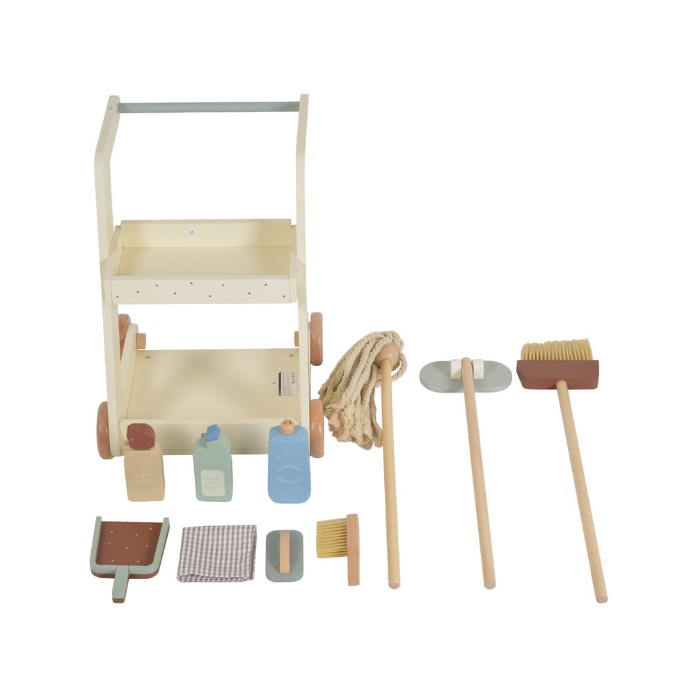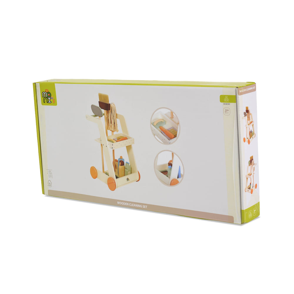 Inspirálja otthon a kis segítőket ezzel a Moni Toys fa takarító kocsival, amelynek valósághű kialakítását a Moni Toys tervezte! Ez a játék a takarítást szórakoztató és oktató játékká alakítja, segítve a képzelőerő, a motorikus képességek és a felelősségérzet fejlődését. A készlet tartalma: • Seprű, felmosó, szivacs és kefék a „takarításhoz” • Fából készült palackok „tisztítószerekkel” a játék kiegészítéséhez • Kerekes és polcos kocsi a könnyű rendezéshez és mozgatáshoz Előnyök: • Ösztönzi a szerepjátékot és a képzelőerőt • Fejleszti a rendtartás és a felelősségérzetet • Biztonságos és kiváló minőségű anyagokból készült • 3 éves és annál idősebb gyermekek számára alkalmas