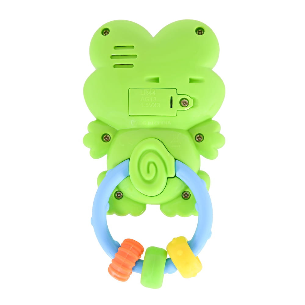 Babacsörgő béka alakú, ZÖLD 3 hónaposnál idősebb gyermekek számára alkalmas. A játék hang- és fényhatásokkal rendelkezik, amelyek stimulálják a baba érzékeit, míg élénk színei lekötik a figyelmét. A csörgőt úgy tervezték, hogy a kis kezek könnyen megfoghassák, a benne található gyűrűvel és további, változatos textúrájú forgó elemekkel. Támogatja a finommotoros készségek és a koordináció fejlődését. Biztonságos anyagokból és festékekből készült, így biztosítja a gyermek biztonságát játék közben. A játék 3 x 1,5 V-os AG13 lapos, kerek kis elemmel működik, amelyeket nem tartalmaz.