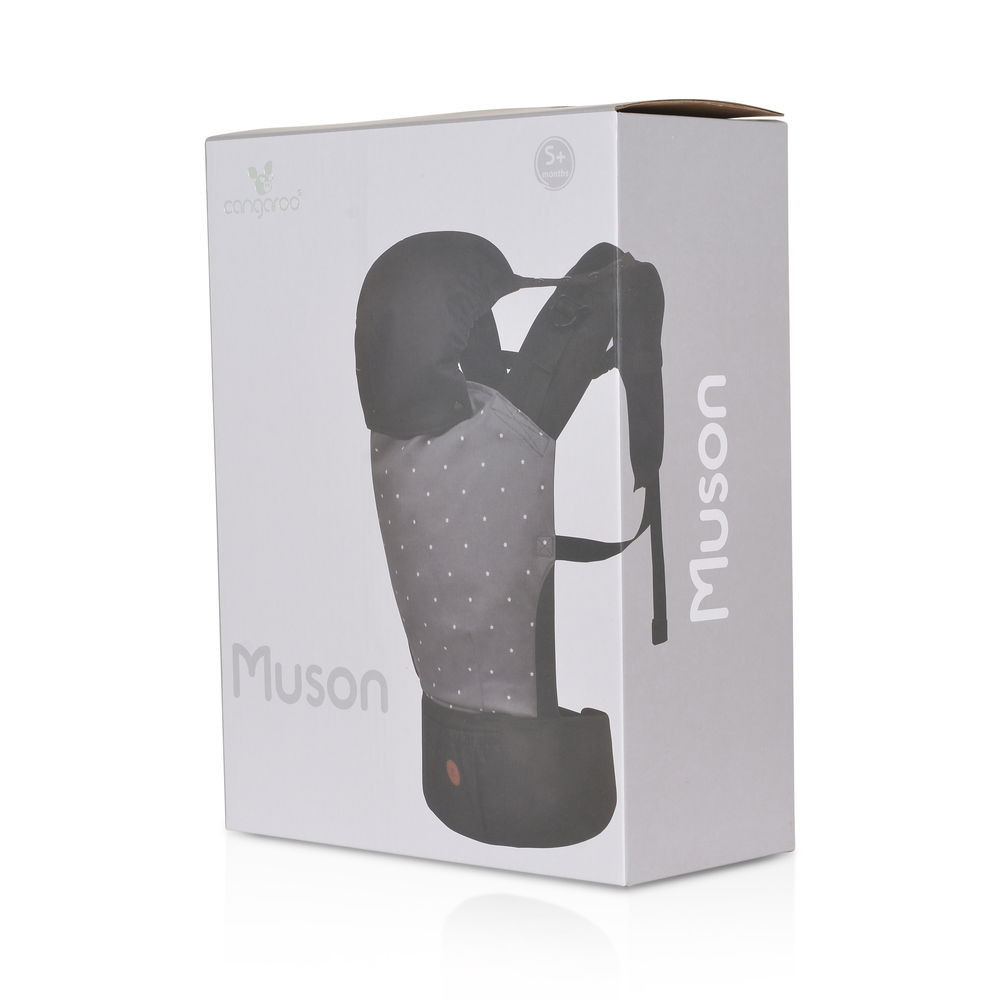 A Muson babahordozó 5 hónapos és legfeljebb 15 kg-os csecsemők számára alkalmas. A fő részek és a kapucni 100% pamutból készültek. Két pozícióban használható - a szülővel szemben vagy a hátán. Állítható vállpántokkal, megerősített derékszíjjal és dupla biztonsági csattal rendelkezik a baba biztonsága érdekében. A kiegészítők számára kialakított zseb és a levehető kapucni extra kényelmet és komfortot biztosít. A termék könnyen karbantartható és kézi mosásra alkalmas. Vidám pöttyös anyaggal.