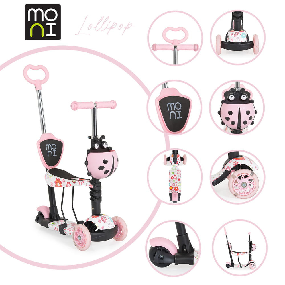 A Moni által készített "Lollipop" nevű 3 az 1-ben roller tökéletes választás 2 éves kor feletti gyerekek számára. A katicás mintázatú, rózsaszín kivitelű roller minden kisgyermek kedvence lesz. A roller vízálló PP platformja 560x140 mm méretű, ami stabil alapot biztosít a gyerekeknek. A roller rendkívül sokoldalú: lehetőséget biztosít a gyerekek számára a szórakozásra és a biztonságos közlekedésre. A katicás mintázat és a vidám rózsaszín színvilág garantáltan mosolyt csal minden kicsi arcára.