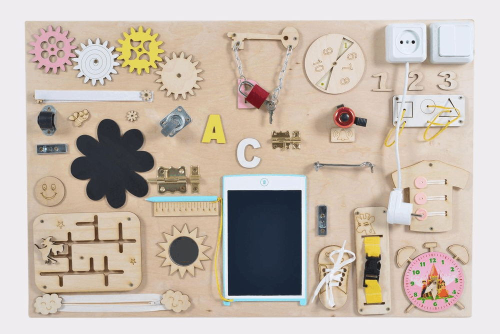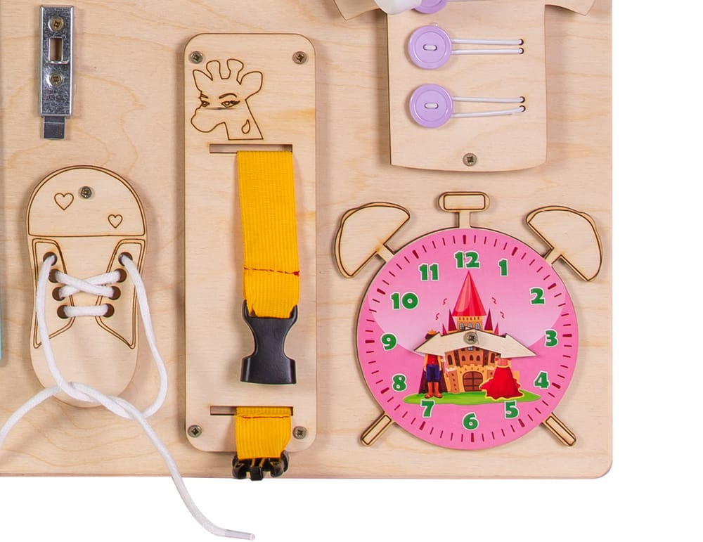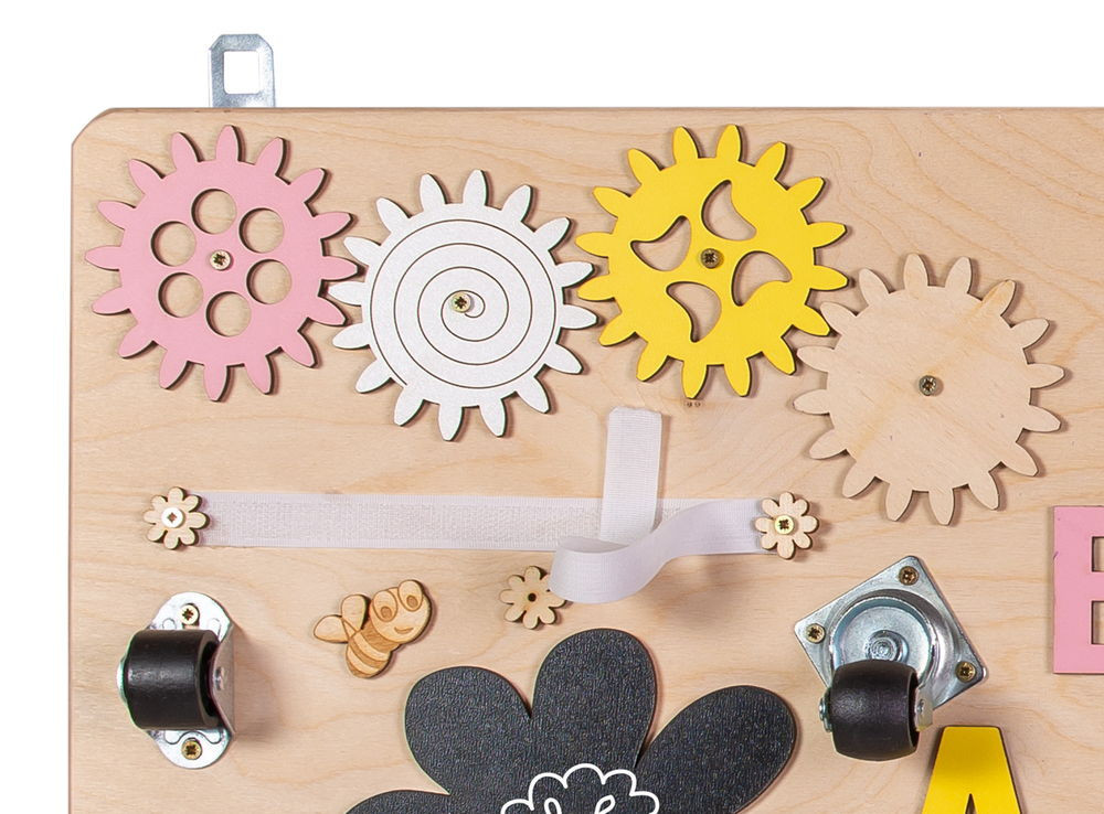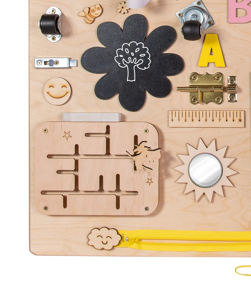A MONTESSORI Matatófal NAGY méretben (75x50cm) a 3-6 éves korosztály számára lett tervezve. Ez a fa tevékenységi tábla számos különböző elemet tartalmaz, amelyek segítségével a gyerekek játékos módon fejleszthetik motorikus készségeiket. A táblán található mozgatható, színes fogaskerekek, cipzár, forgó kerekek, tépőzár, két féle zár, egy mozgatható mutatókkal ellátott óra, záróhorog, villanykapcsoló, lakat kulcsok, érintőkábel és csatokkal ellátott öv. Mindezek a funkciók hozzájárulnak a gyerekek átfogó tanulási élményéhez. A tábla segítségével megismerhetik a különböző formákat, színeket, mozgásokat és mechanizmusokat, miközben fejlesztik a finommotorikus készségeiket és a problémamegoldó képességeiket. Ez a matatófal tökéletes ajándék lehet minden kis felfedező számára!