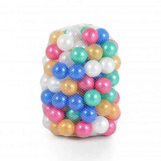 100 darab színes labda 6 cm átmérővel hálóban. Gyöngyház színű labdák, puha műanyagból.